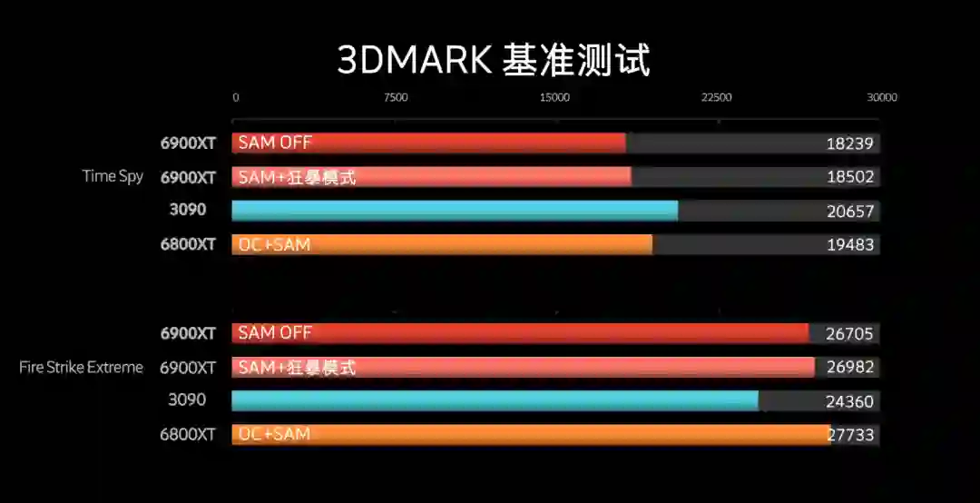遇事不决跑个分,DX12里3090跑分领先了11.6%,DX11里6900XT领先10.7%,驱动里超到2.75GHz的6800XT,DX11得分比大哥6900XT还高一些。