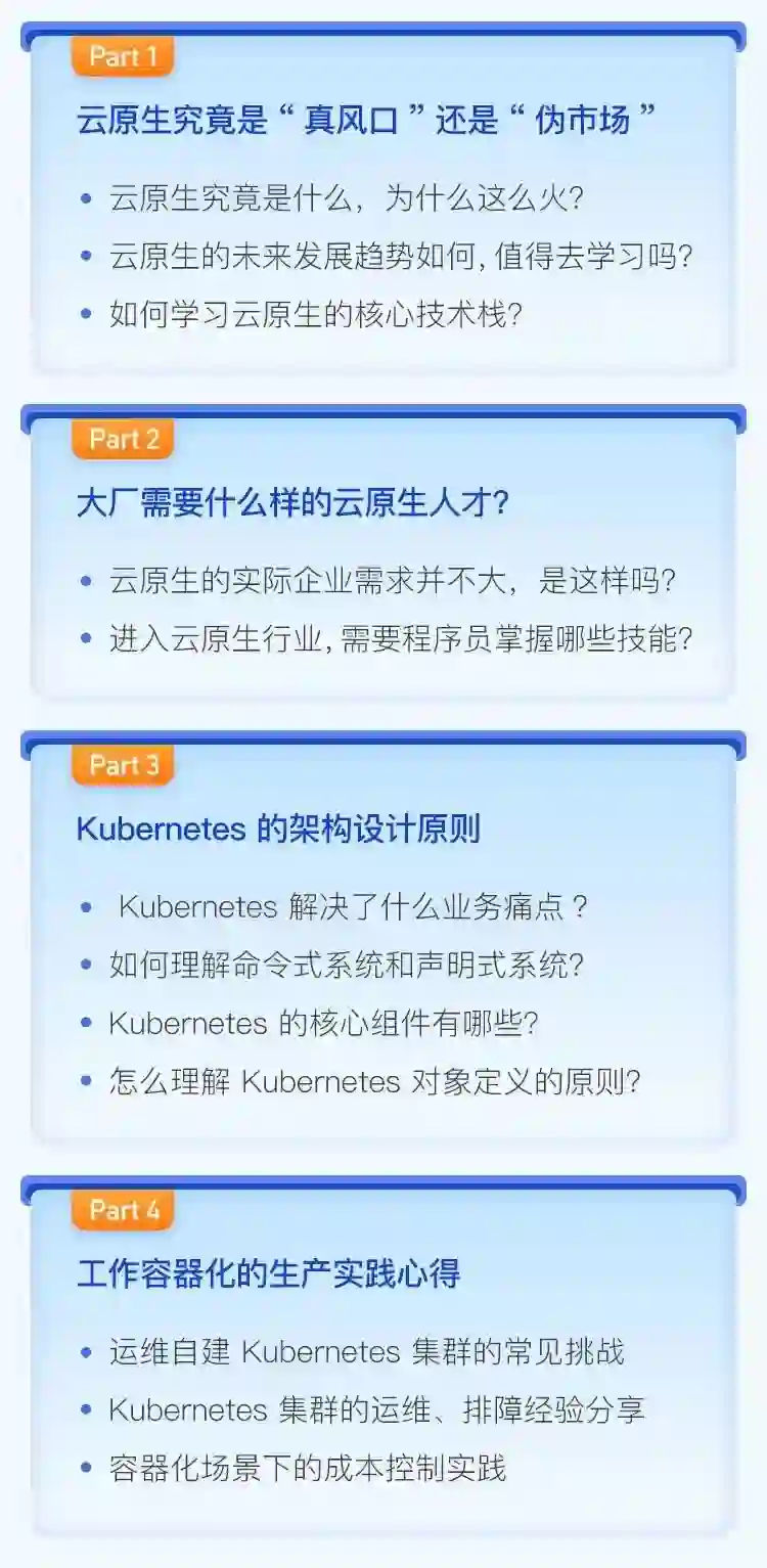 2. 来自腾讯、eBay等多家大厂专家倾情贡献的《4小时带你入门云原生》视频课,从概念到技术实现,带你真正搞清楚云原生的前世今生。
