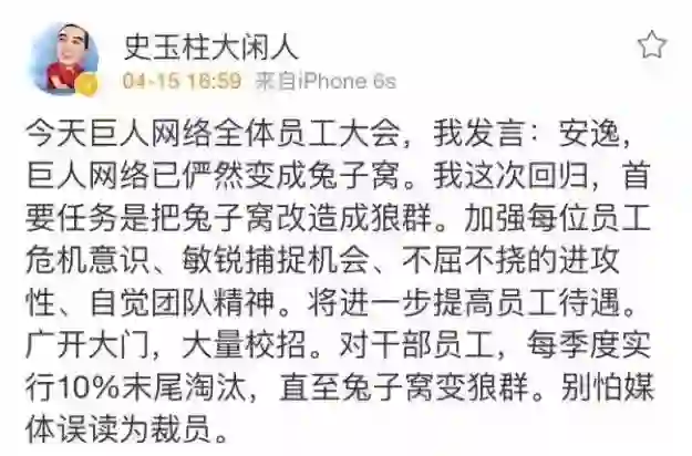 大概2年前吧,巨人网络的史玉柱前辈折腾了一出戏:向马爸爸取经,要搞狼性文化,恁死团队里的兔子。落地的政策也是很传统——末位淘汰。