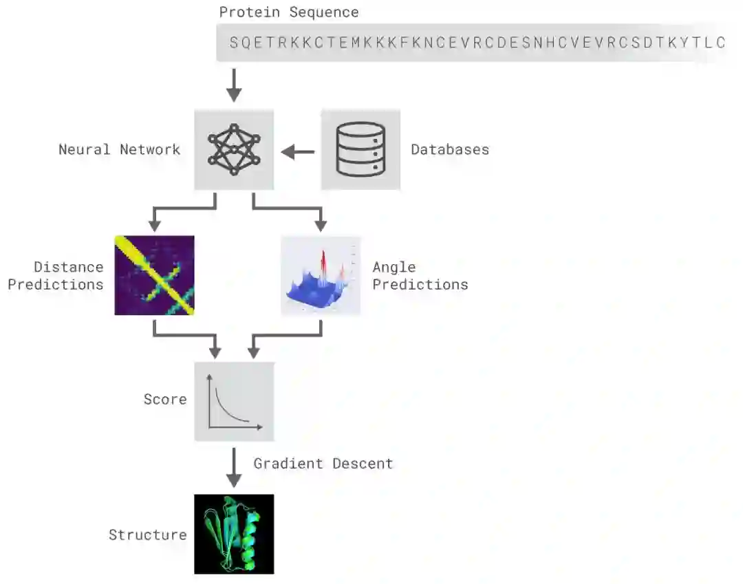 DeepMind团队使用的方法都以深度神经网络为基础,来从基因序列中预测蛋白质的两种物理性质:氨基酸对之间的距离及连接这些氨基酸的化学键之间的角度。首先,研究小组训练了一个深度神经网络,来预测蛋白质中每对氨基酸残基之间距离的分布情况。然后,研究人员将这些数值转化为评分,来对蛋白质结构的精确程度进行评估。同时,研究人员还另外训练了一个神经网络,利用这些距离数值来评估预测结构与真实结构的接近程度。