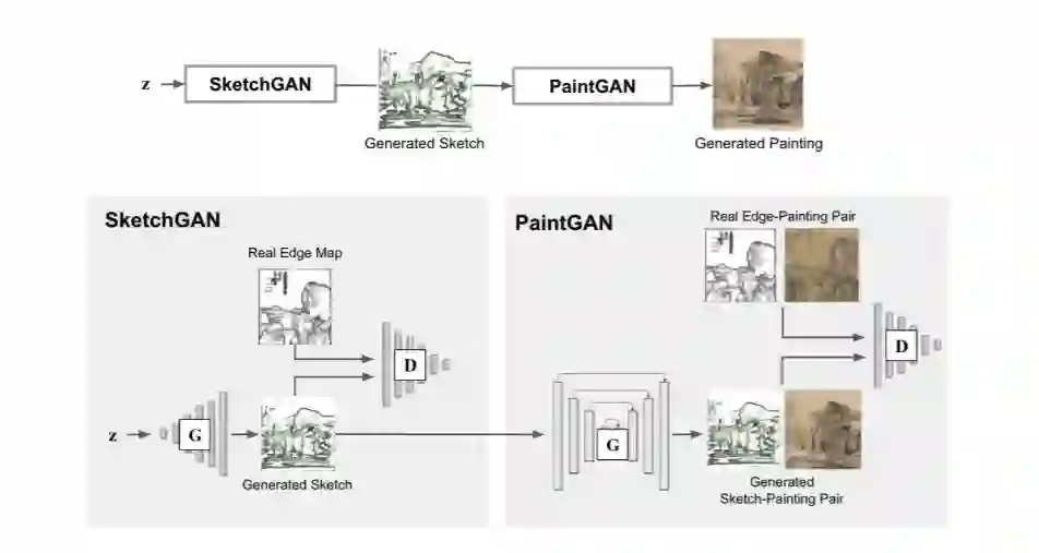 为了实现这一过程,AIice构建了两个模型:Stage I: SketchGAN ;Stage II: PaintGAN。SketchGAN是从样本图像中采集高分辨率的边缘图,而PaintGAN是根据SketchGAN进行“翻译”创作,从而生成一幅完整的山水画。