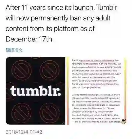 事起两日前,轻博客Tumblr(中文俗称“汤不热”)发布了一则公告,宣布将从12月17日起,开始成人内容禁令。