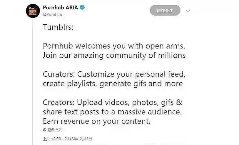 在Tumblr的公告发出后一天,号称世界上最大的色情网站Pornhub迅速蹭了这个热点,试图将Tumblr用户吸引过来: