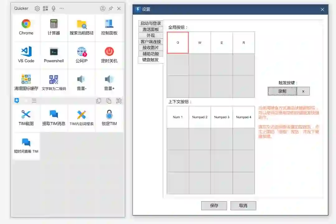 激活主面板之后,可以为每个按钮自定义一个触发按键,解决了以往「纯快捷键不够直观的问题」,即使你不喜欢鼠标操作,也可以用纯键盘操作使用 Quicker。 可以说是兼顾了鼠标党和键盘党的感受。