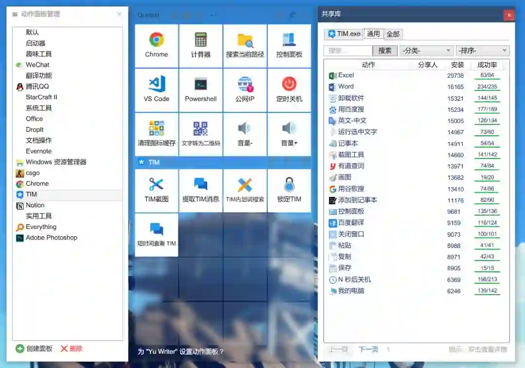 全靠自己做动作难免有些麻烦,Quicker 为此提供了一个官方的动作共享库。每个人都可以把自己做的动作分享到共享库中。