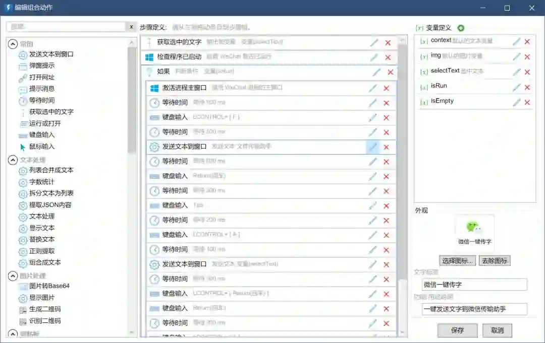 Quicker 内置了一个「组合动作编辑器」,左侧内置了丰富的快捷动作,从字数统计到执行脚本,还有「循环、判断」等逻辑动作,右侧则可以自定义一些需要用到的变量。把这些快捷动作拖到中间,组成特定的步骤就可以做出属于自己的动作了。