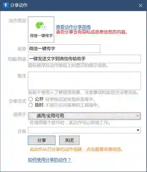 分享方式可以分为「公开分享」和「临时分享」,分享后会同时生成一个链接和一个网页。将链接粘贴到主面板中就会自动变成动作。
