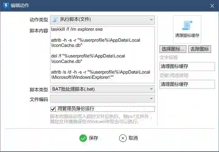 Quicker 的另一个高级动作是「执行脚本」,支持 CMD 命令、CMD 批处理、BAT 批处理、PowerShell 脚本,以及 AutoHotkey 脚本,允许直接通过管理员身份运行。所以「清理图标缓存」「定时关机」等常用的批处理命令都可以直接交给 Quicker 来运行。
