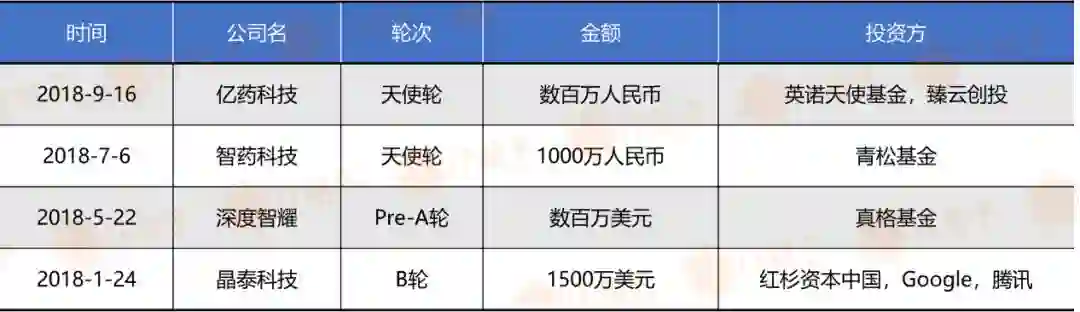 今年 5 月以来,真格基金、青松基金和英诺天使基金等多家早期投资机构开始对该领域国内早期项目进行了投资,深度智耀、智药科技、亿药科技 3 家公司获得了数百到数千万不等的投资金额。