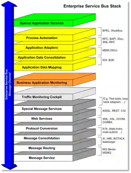 竖井就像是企业服务总线(ESB)。ESB 就像是煤矿的主干,旷工和煤炭通过这个通道被送到地表。ESB 扮演了共享消息主干的角色,将应用程序和其他服务连接在一起。ESB 为企业提供了传输协议、负载和数据的调解器,可以实现各种集成场景。