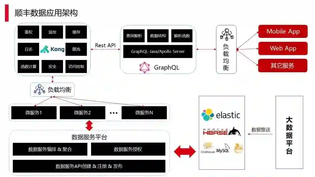 大数据平台,中间的基础部分是大数据平台,这块是顺丰结合开源组件自行搭建的。与之相关的是大数据分析与人工智能,顺丰有一个非常强的地面部队,就是线下的快递小哥以及运输车辆,需要使用 AI 以及大数据分析来辅助管理,提升整体效率。