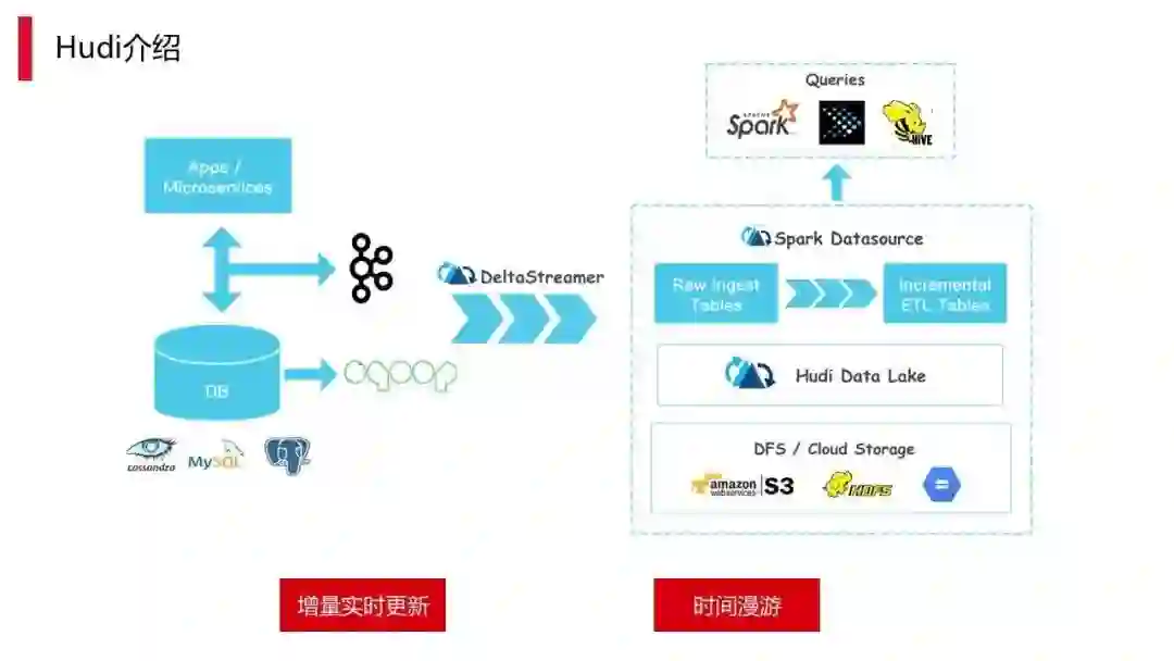 另外,时间漫游。之前我们有很多应用需要做准实时计算。如果要找出半个小时内的增量到底是什么,变化点在哪,必须要把一天的数据全捞出来,过滤一遍才能找出来。Hudi 提供时间漫游能力,只需要类似 SQL 的语法就能快速地把全部增量捞出来,然后后台应用使用时,就能够直接根据里面的数据做业务的更新,这是 Hudi 时间漫游里最重要的能力。