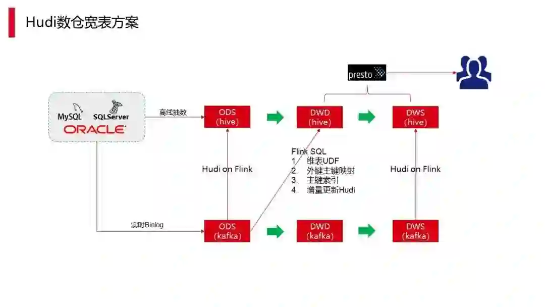 第一层,对于 ODS,可以直接连接 Kafka,用 Hudi on Flink 的框架就能够完成。