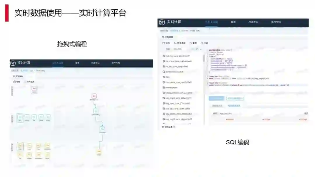 我们在平台上也做一些简化的内容,首先有一部分是关于拖拽的,拖拽是指封装一些组件,用户可以通过拖拽来快速完成其需求。这个产品上线后,很多之前没有任何实时计算的经验,甚至连离线开发的经验也没有的用户都能够做实时的数据开发。