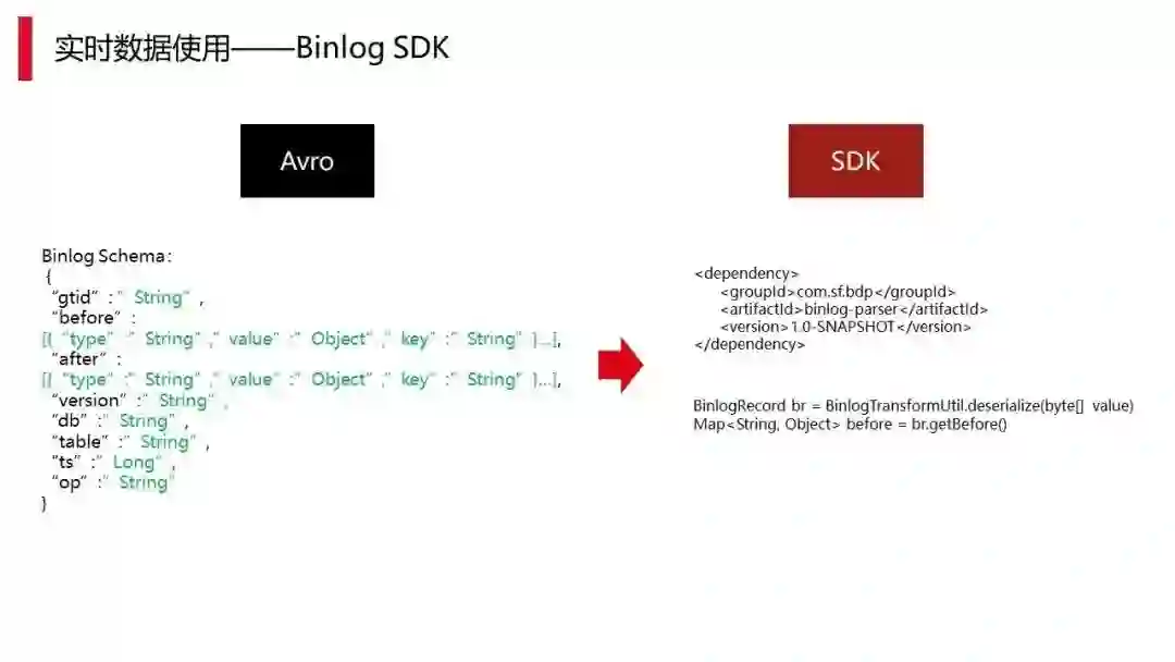 上图是我们 binlog 的 SDK,其实像 binlog 这种 avro 的格式,对用户来说使用有一定门槛。但还是有一些编码的用户,对于这些用户我们提供具体的 SDK,所以在 SDK 里真正使用时都做到简便。左边看起来是 json,实际上是 avro 格式。右边的内容就是在 Java 上的使用情况,这个是在代码层面辅助研发快速应用的工具。