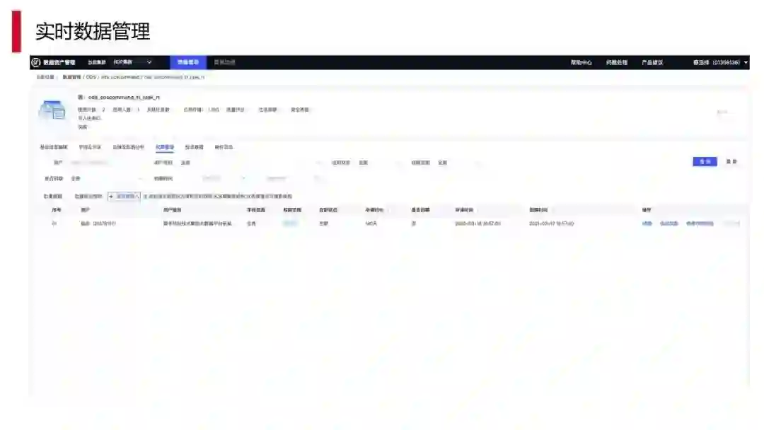 另外,数据接入进来之后,需要有数据管理的能力。上图是数据管理能力测试环境的简单情况,我们需要让用户能够管理相关的数据,首先谁用它了,其次它涉及什么字段,有哪些具体的内容,同时它里面的血缘关系又是怎么样的,这个就是我们数据资产管理所具备的功能。