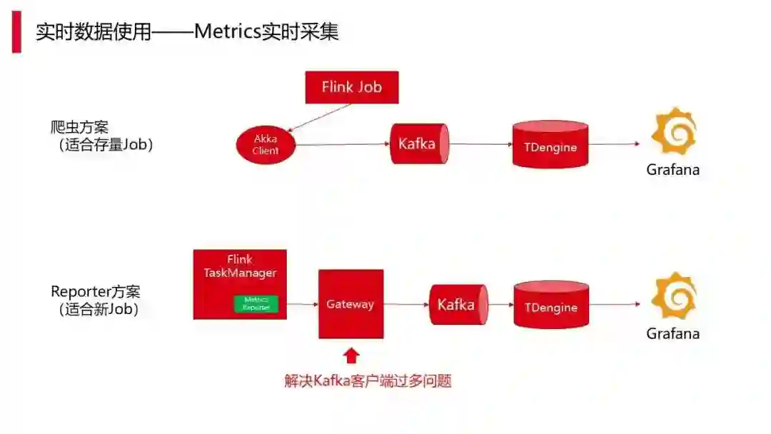 这里在监控里面也做了几个工作,一个是爬虫方案,实现一个 akka 的客户端,Flink 本身是 akka 的框架,每个 jobmannager 都有 akka 的服务、接口,这样只要实现一个 akka 的客户端,就能够以 akka 的 API 形式获取具体的 Metric 情况。这部分采集完之后发到 Kafka,最终存到 TDengine 再到 Grafana,提供给用户。Grafana 也会整合到我们的实时计算平台产品里面来,在面对存量的情况时,不需要重启用户的任务,就能够直接做数据采集。