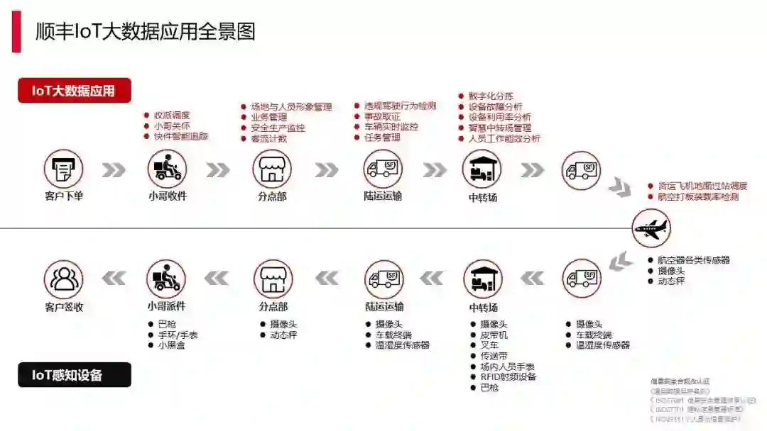 IoT,就像之前提及到的,因为顺丰地面部队较多,相应需要采集的数据也会比较多。我们的部分包裹中是有传感器的,车辆也有相关的传感器,如车辆的摄像头,以及快递小哥的手环(包含地理位置、员工的健康状态,对应做一些关怀的举动)。同时,还有一些工作场景既有叉车,也有分拣设备,这些就需要大数据平台来做一些联动,因此 IoT 的应用相对较多。