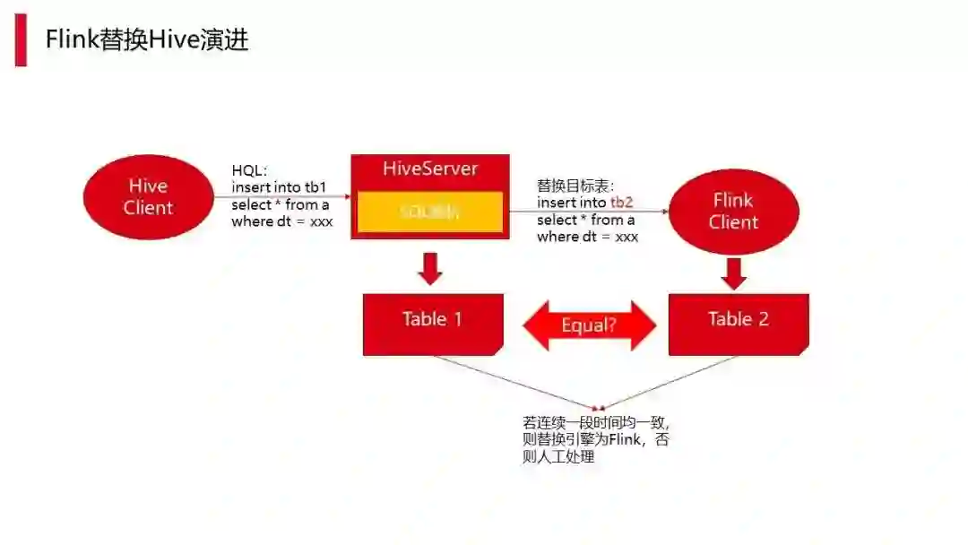 首先我们用 Flink 来替换,由于强制或平台自动推荐都有难度,所以我们做了一些折中方案。比如埋点,当需要把数据写到 Hive 的某个表,它会经过 Hiveserver,SQL 解析之后,此时将表进行替换,执行两个路线:一个是正常的 table 这样执行会写到 Hive 里面去。另外也会埋点把写的表替换成另一个表,然后同时再以 Flink 的形式去执行一遍,不过会产生额外的资源消耗,执行大概生成两个表,需要自动计算两者是否一致。如一致测试稳定后就能以计算框架来去替换它。