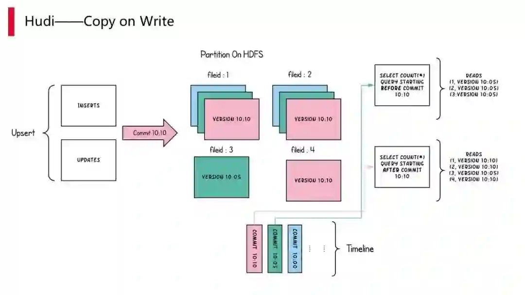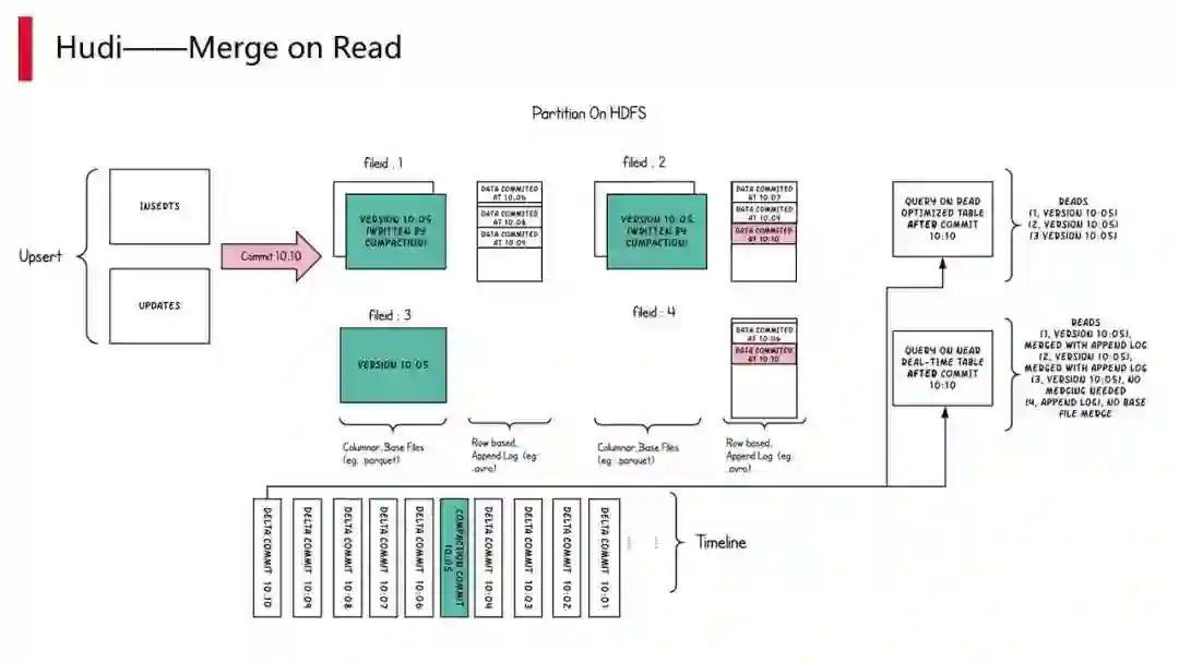 merge on read 就是写的时候实时会把 log 以 append 方式写到 HDFS 中并写成文件,然后在读的时候将已经生成的文本,再加上增量的部分合并,做一个 merge 操作。好处在于查询的时候数据都是实时的,但是由于查询任务确实较多,相当于是说每次查的时候,都要把两部分数据取出来并做一个合并,因此也会造成损耗。
