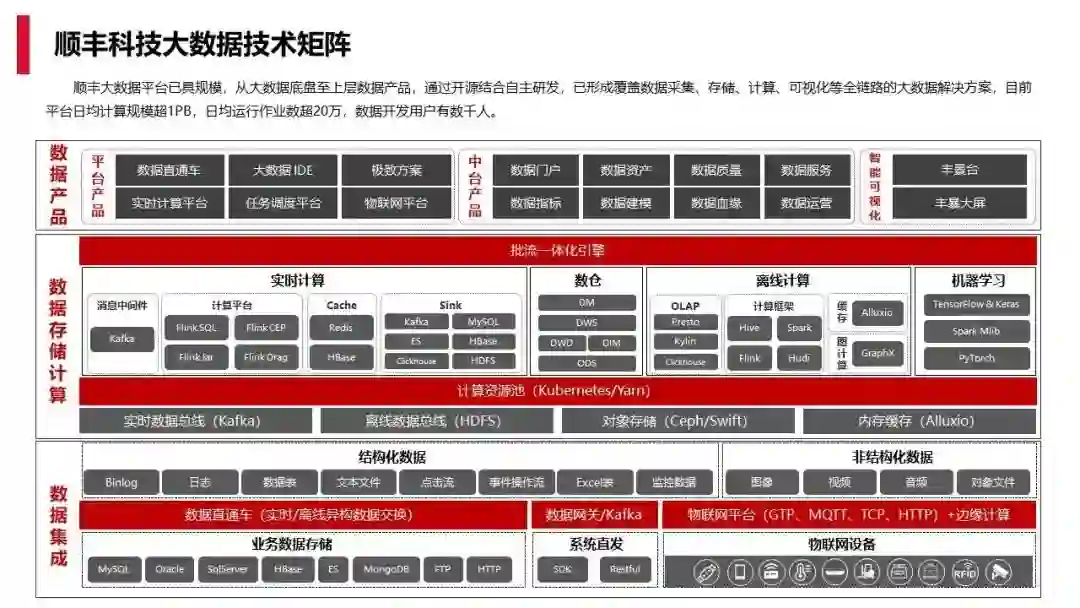 数据集成层:最下面为数据集成层,因为顺丰的历史原因,所以包含了很多数据存储引擎,如 Oracle、MySQL、MongoDB 等,并且部分引擎仍会继续支持。右下物联网设备相对较新,主要是进行包含普通文本、网络数据库、图像、音频、视频等的数据采集。