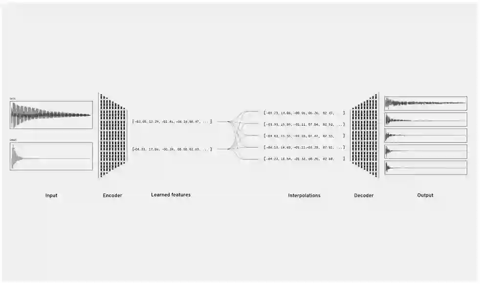 使用自动编码器,它可以从每个输入中提取16个时间特征。然后将这些特征线性插入创建新的嵌入(每个声音的数学表示)。然后将这些新的嵌入解码成新的声音,这些声音具有两个输入的声音质量。