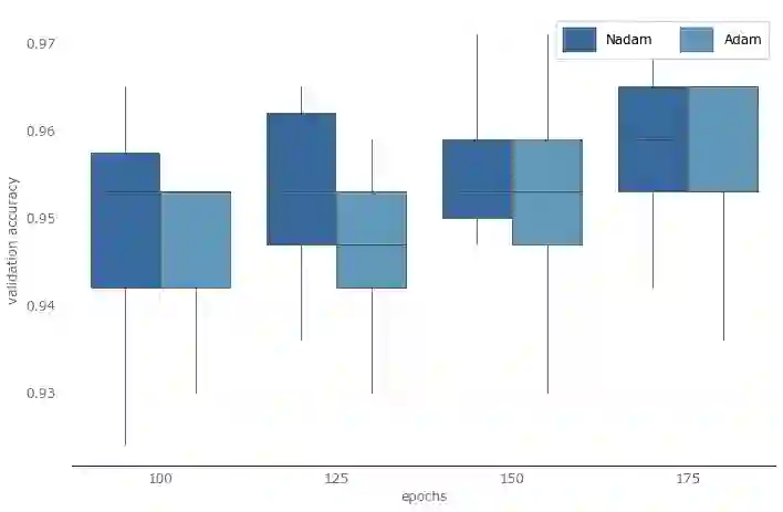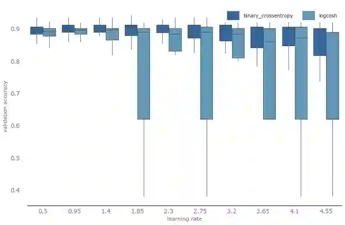 接下来我们再仔细看看学习率(不同优化算法的学习率经过了归一化处理)。这次我们将绘制箱形图,纵轴为验证精确度,横轴为学习率。