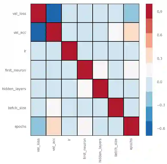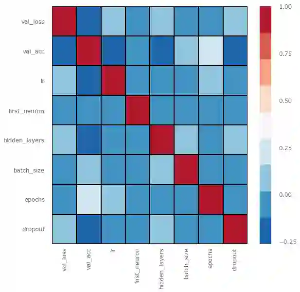 从上图我们可以看到,似乎hidden_layers(隐藏层数目)、lr(学习率)、dropout对val_acc的影响较大(负相关性),而正相关性比较强的只有epoch数。