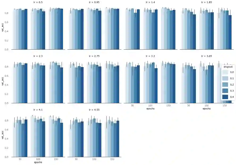 其中,y轴为精确度,x轴为epoch数,色彩浓淡表示dropout率,刻面(facet)表示学习率。
