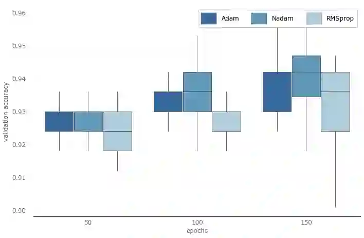 其次,由于在epoch数为100和150的情形下,RMSprop的表现都不怎么好,所以我们将在下一回合的试验中移除RMSprop。