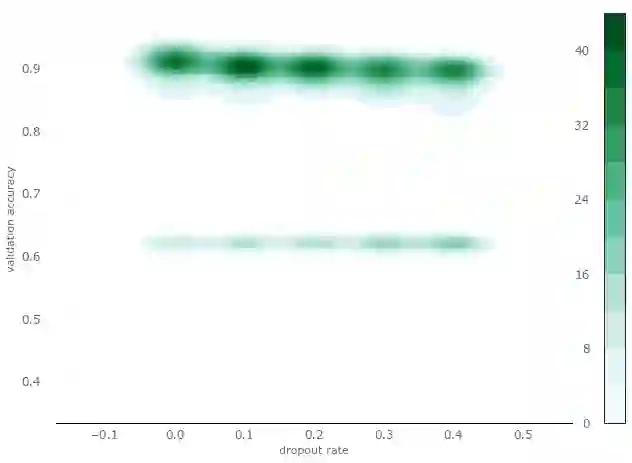从图中我们可以看到,dropout为0到0.1时,更可能得到较高的验证精确度(纵轴0.9附近),不太可能得到较低的精确度(纵轴0.6附近)。