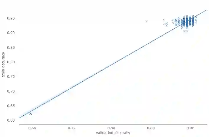 正如我们一开始提到的,在优化超参数时,同时考虑概括性很重要。每次我们查看在验证集上的结果并据此调整时,我们增加了过拟合验证集的风险。模型的概括性可能因此下降,虽然在验证集上表现更好,但在“真实”数据集上的表现可能不好。优化超参数的时候我们并没有很好的测试这类偏差的方法,但至少我们可以评估下伪概括性(pseudo-generalization)。让我们先看下训练精确度和验证精确度。