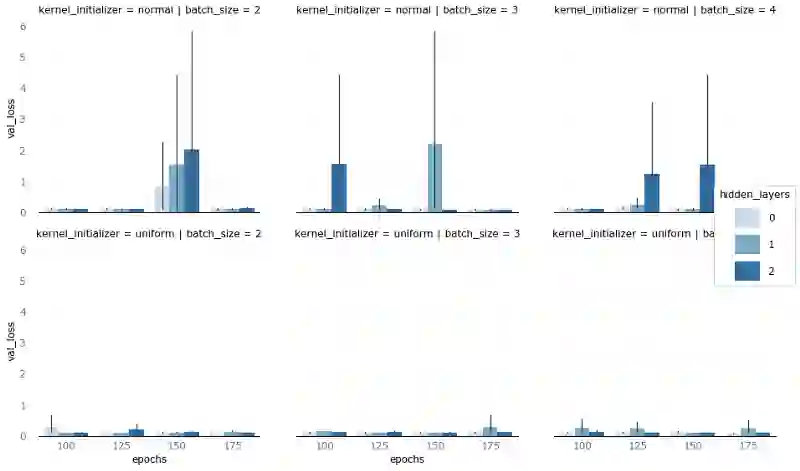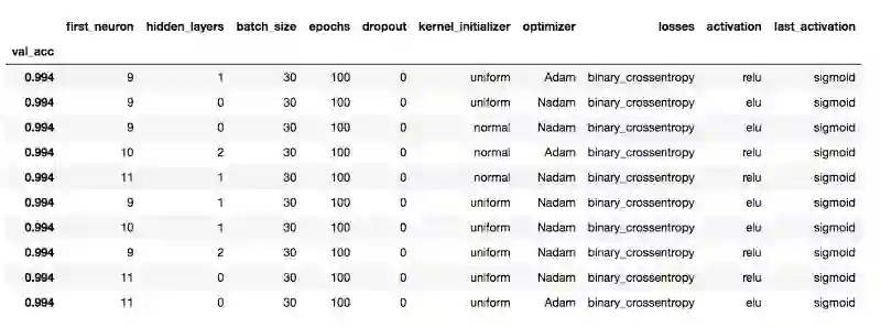 我觉得我们已经从初次试验中得到足够多的信息,是时候利用这些信息开始第二次试验了。除了上面提到的改动之外,我还额外增加了一个超参数,kernel_initializer。在第一次的试验中,我们使用的都是默认的高斯分布(normal),其实均匀分布(uniform)也值得一试。所以我在第二次试验中补上了这一超参数。