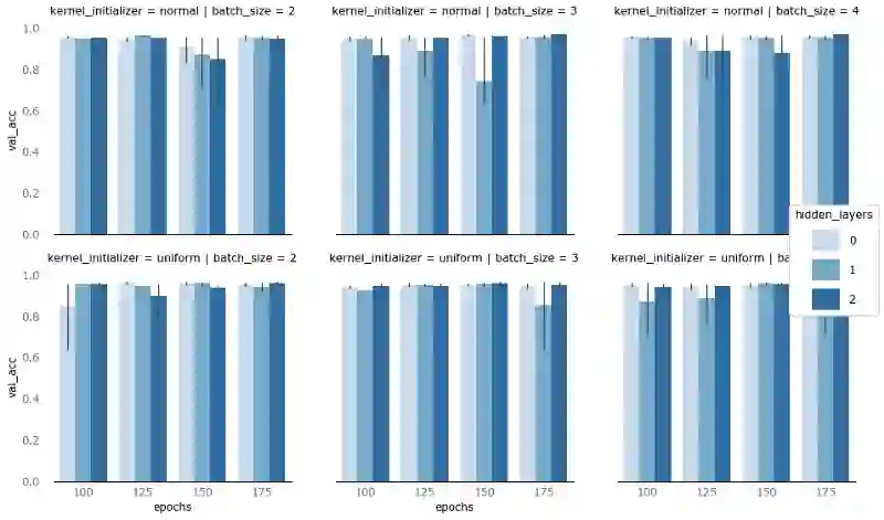 大部分结果都是肩并肩的,但还是有一些东西突显出来。如果因为隐藏层层数不同(色彩浓淡)导致验证精确度下降,那么大多数情形下,下降的都是1个隐藏层的模型。至于batch尺寸(列)和核初始化(行)的差别,很难说出点什么。