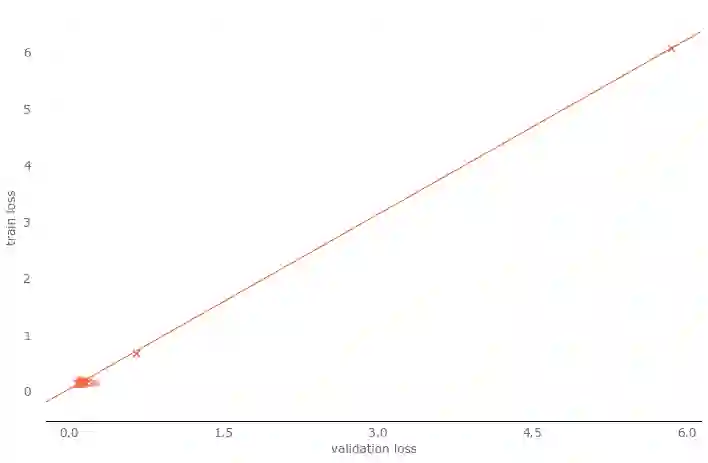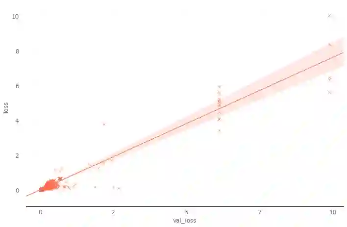 很明显,在两种损失函数上,都是较低的学习率表现更好。在logcosh上,高低学习率的差异尤为明显。另一方面,在所有学习率水平上,交叉熵的表现都超过了logcosh,因此在之后的试验中,我们将选择交叉熵作为损失函数。不过,我们仍需要验证一下。因为我们看到的结果可能是过拟合训练集的产物,也可能两者的验证集损失(val_loss)都很大。所以我们进行了简单的回归分析。回归分析表明,除了少数离散值外,绝大多数损失都聚集在左下角(这正是我们所期望的)。换句话说,训练损失和验证损失都接近零。回归分析打消了我们之前的疑虑。