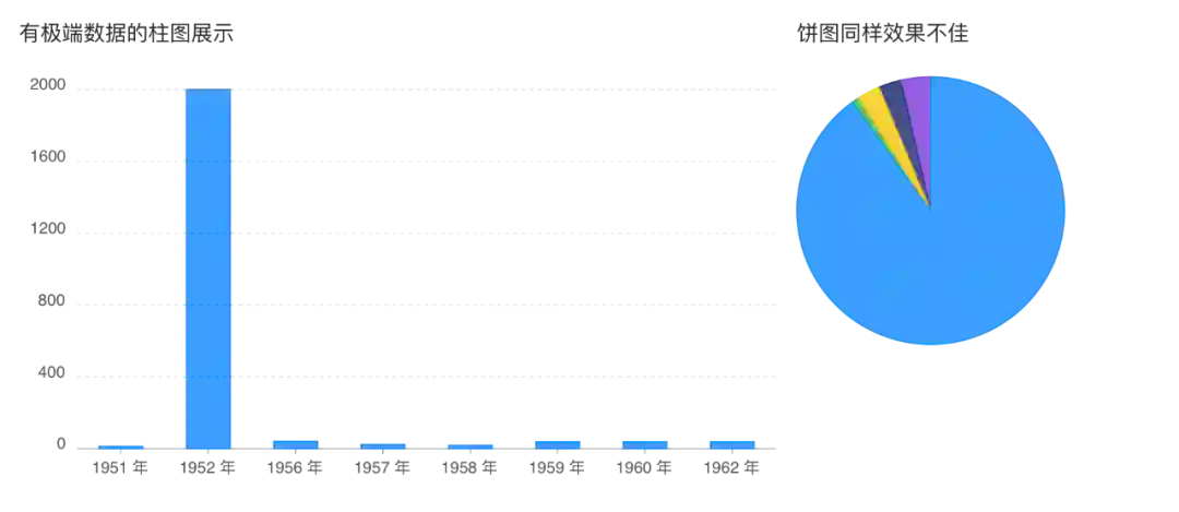 极端数据指一种样本数据极端分布不均匀的情况,比如“100条某产品的销量分布,1条记录10W,其余99条记录在0~1000之间,“如实”反应数据的图表将很难看出**大部分样本数据的特征信息**。需要结合业务场景,做应对处理(比如剔除&“矮化”极端数据,并做对应的文本解释)