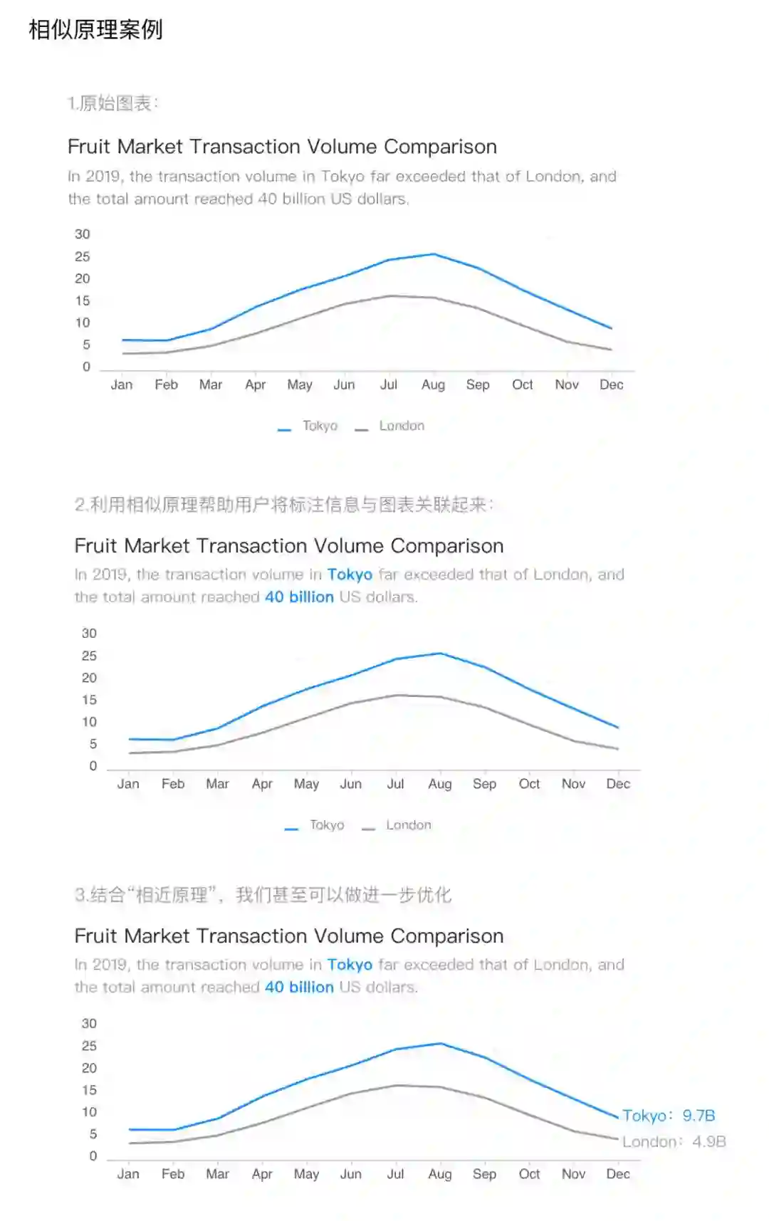 灵活利用格式塔原理与视觉编码特性,是数据可视化在具体图表之下的更为重要的知识技巧。篇幅原因,不再一一列举。