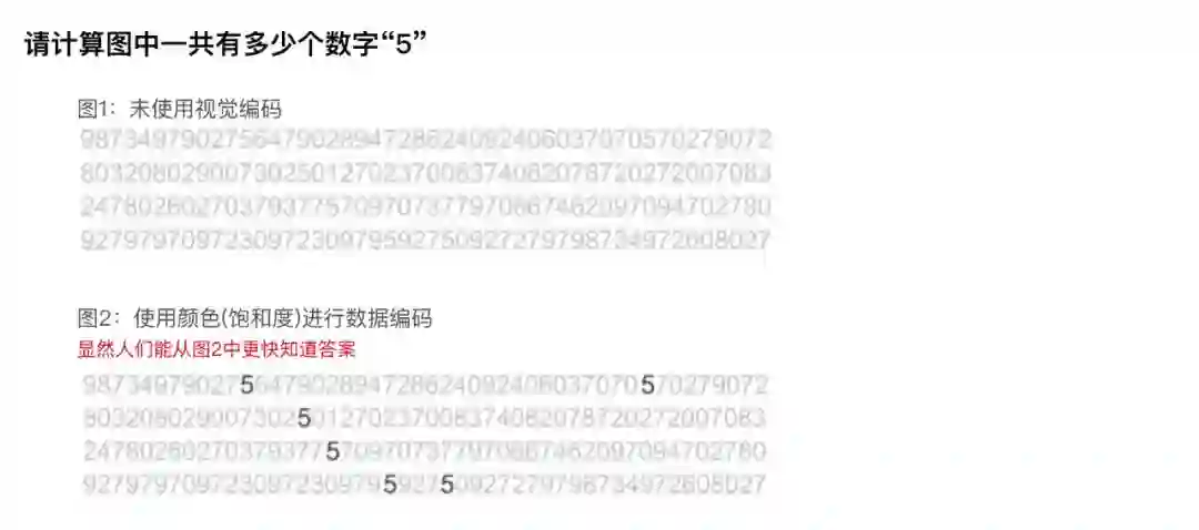 这种心理学现象,叠加颜色色调的处理,很容易促成视觉突出,使我们能够快速注意到被处理的目标数据。上文视觉编码数“5”的举例,便是相似原则的一个案例。