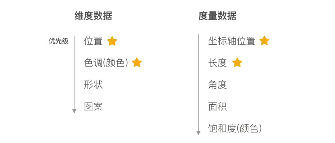 维度和度量所适用的视觉通道是有巨大差异的,例如颜色的色调适用于维度,但不适用于度量。选择正确的视觉通道,令信息传达更有效率。