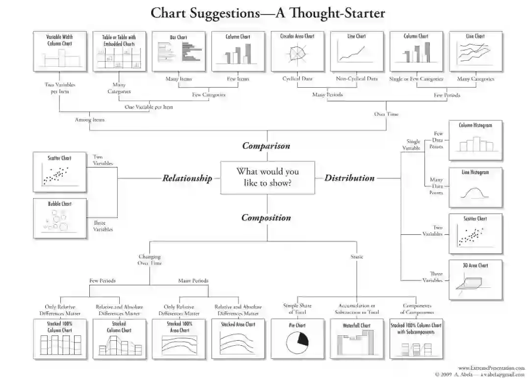 这个网上资料一抓一大把,选择图表前,其实更多的是要想清楚你的数据想传达的目的。数据分析纷纷咋咋,总结起来,不外乎4个目的:对比、聚焦、归纳、演绎。基于这些初始目的出发,我们再选择实例化它。