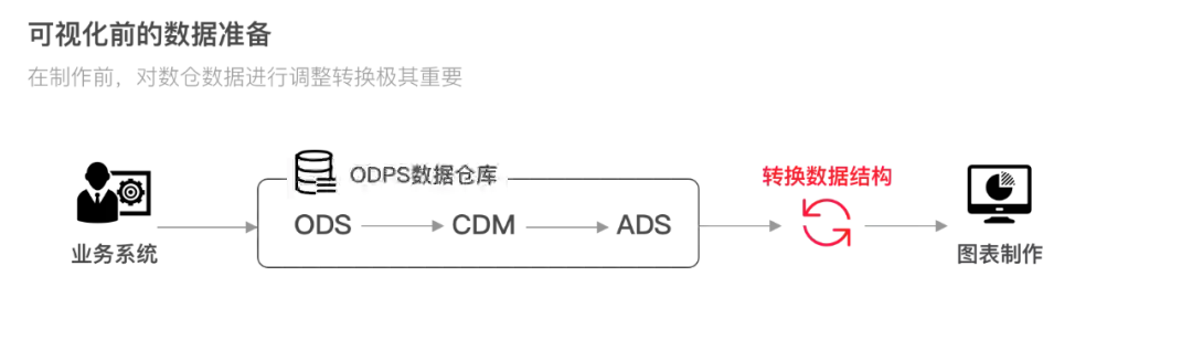 一般来讲,制作数据图表前,或多或少有一系列数据的采集加工环节,以集团开发同学熟悉的ODPS为例,简单来讲如下图流程所示: