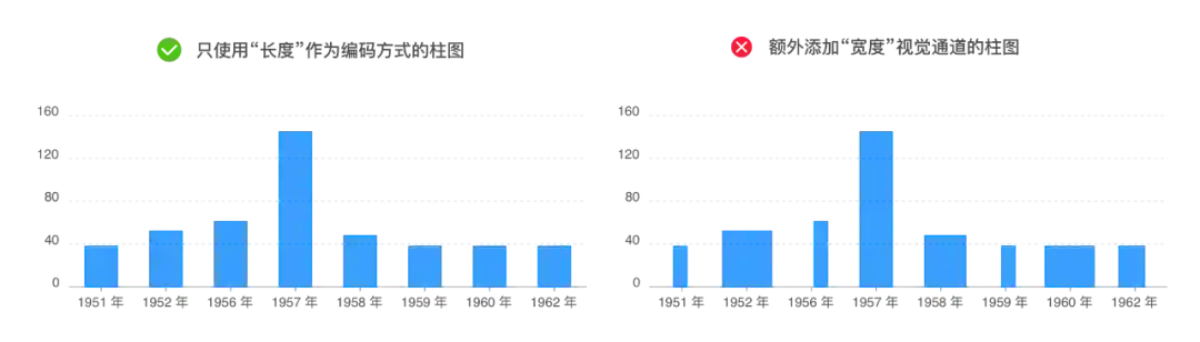 我们结合柱形图做一个举例,下图的柱图使用了宽度(size)映射了一个度量字段数据,宽度影响了长度的有效力,这两个通道的同时使用,使得感知上有趋近面积这一通道,从而影响了整体图表的效果。