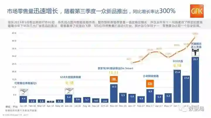 据GfK监测数据显示,2016年中国智能家电产品市场零售额为2091亿元人民币,预计2017年可达2815亿元人民币,同比增长34.6%,增长势头强劲。2015年京东联合科大讯飞推出叮咚智能音箱,成为第一个试水中国智能音箱市场的企业,之后阿里巴巴和小米等企业也纷纷加入入口抢夺战。下一波有众多传感器的无人机和机器人等将会成为智能家居的入口。