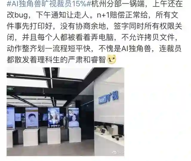 今年2月27日,微博爆料显示,AI独角兽旷视科技裁员15%,其中,杭州分部一锅端。该爆料人称,员工上午还在写代码,下午就通知走人。N+1赔偿,所有的文件事先打印好,没有协商的余地,签字的同时所有权限关闭。消息当天,雷锋网向旷视科技求证,对方表示消息不实,都是正常年度业务调整。