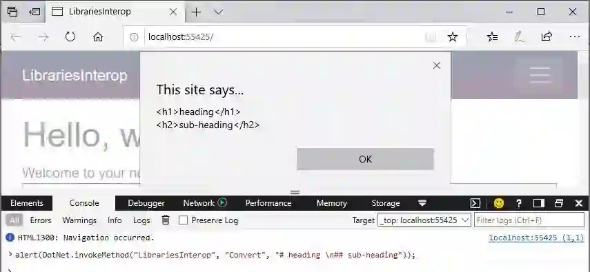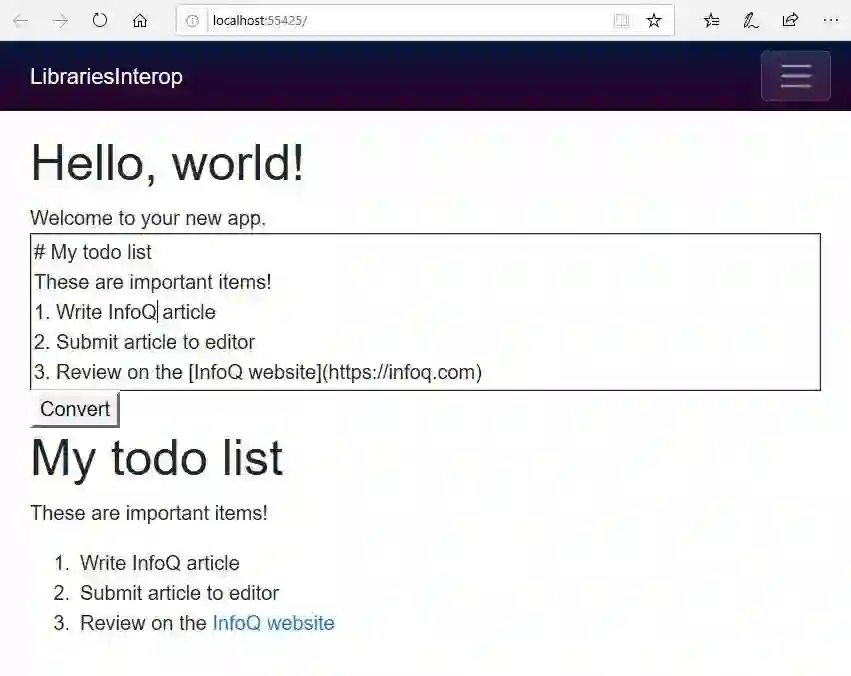 InvokeAsync 方法支持传递和返回值,这些值将自动在 JavaScript 与.NET 之间转换并由 Blazor 运行时编组。使用 JsInvokable 属性来暴露 C# 方法,以便可以从 JavaScript 调用它。下面是一个例子,它封装了 Markdown 转换调用: