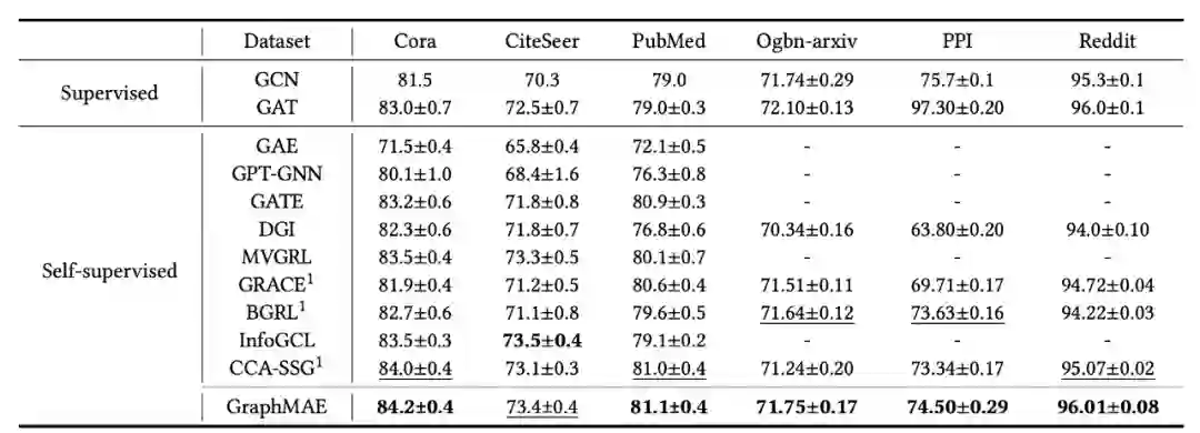 实验结果如表 1 所示,与 SOTA 的自监督模型相比,GraphMAE 在所有的数据集上都取得了最好或相当的(comparable)表现,且 GraphMAE 的表现大大超过了现有的生成性自监督模型。