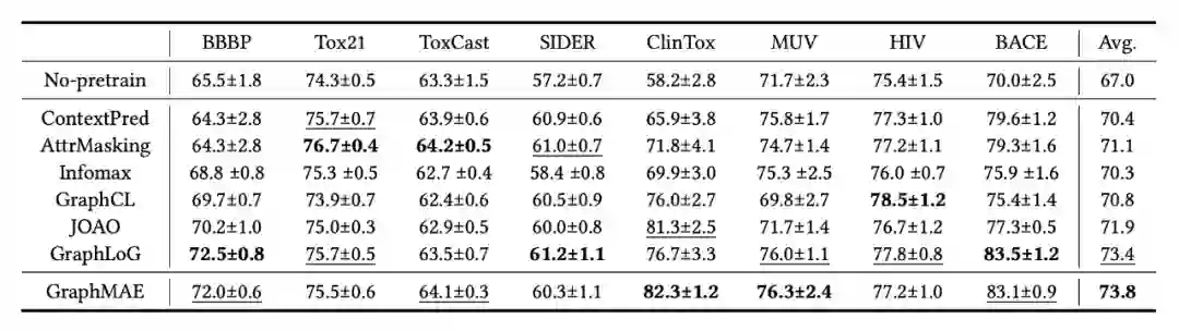 实验结果如表 3 所示,GraphMAE 在迁移学习任务上的表现与基线相当(comparable)。其中,GraphMAE 取得了最好的平均分数,且在 2 个数据集中比基线的最佳结果有小的提升。这证明了 GraphMAE 强大的可迁移性。