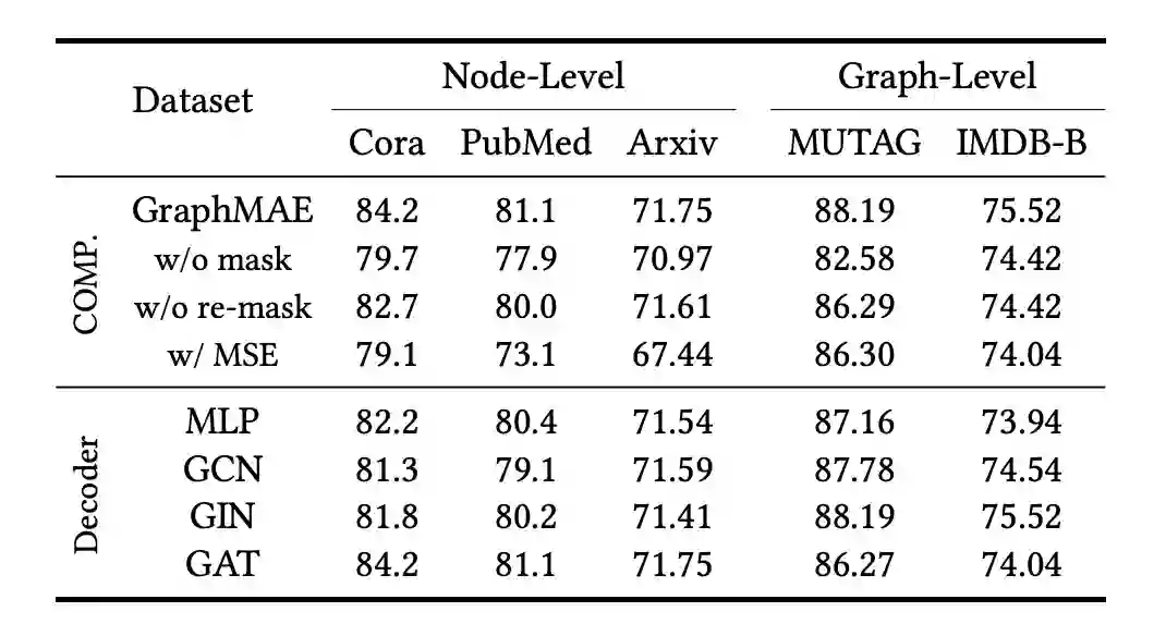 为了验证 GraphMAE 主要组成部分的效果,我们进一步进行了一系列的消融研究。实验设置及细节不多做赘述,有兴趣的读者可自行阅读全文。