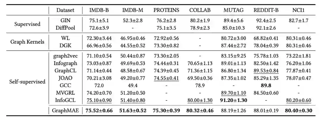 实验结果如表 2 所示,GraphMAE 在 7 个数据集中的 5 个上超过了所有的无监督基线,在另 2 个数据集上也表现相当。这些数据集的节点特征都是独热向量,信息量相对节点分类的数据集较少。GraphMAE 在这些数据集上的较好表现证明了生成式自动编码(generative auto-encoding)可以学习到更有意义的信息,并在图级任务(graph-level tasks)中具有潜力。