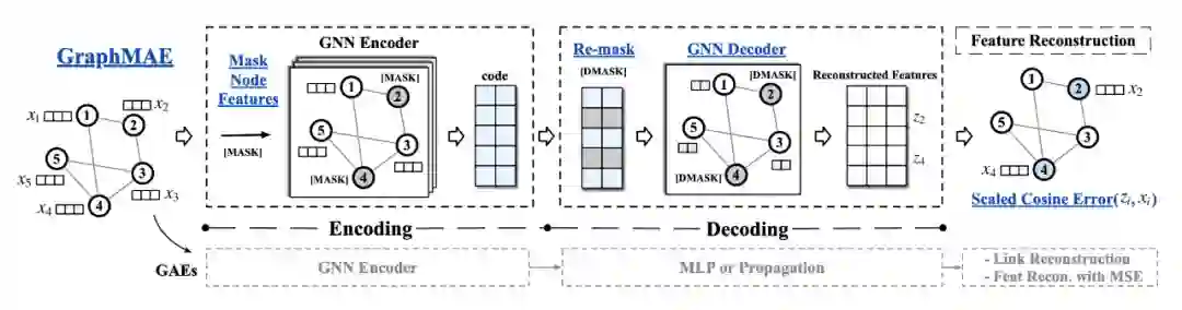 为了缓解现有 GAE 所面临的 4 个问题及使得 GAE 的表现能与对比图学习(contrastive graph learning)的相匹配或超越,这篇文章提出了一个用于自监督学习的屏蔽图自动编码器(masked graph autoencoder)——GraphMAE。GraphMAE 的核心思想在于重建被遮蔽的节点特征(masked node features)。具体来说,GraphMAE 引入了带有二次遮蔽策略(re-mask decoding strategy)的 GNN 作为解码器(decoder),而不是 MLP。